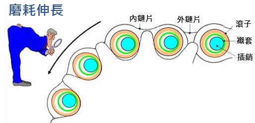 當「鏈條」與「鏈輪」咬合時,插銷與襯套間的摩合會發(fā)生摩耗